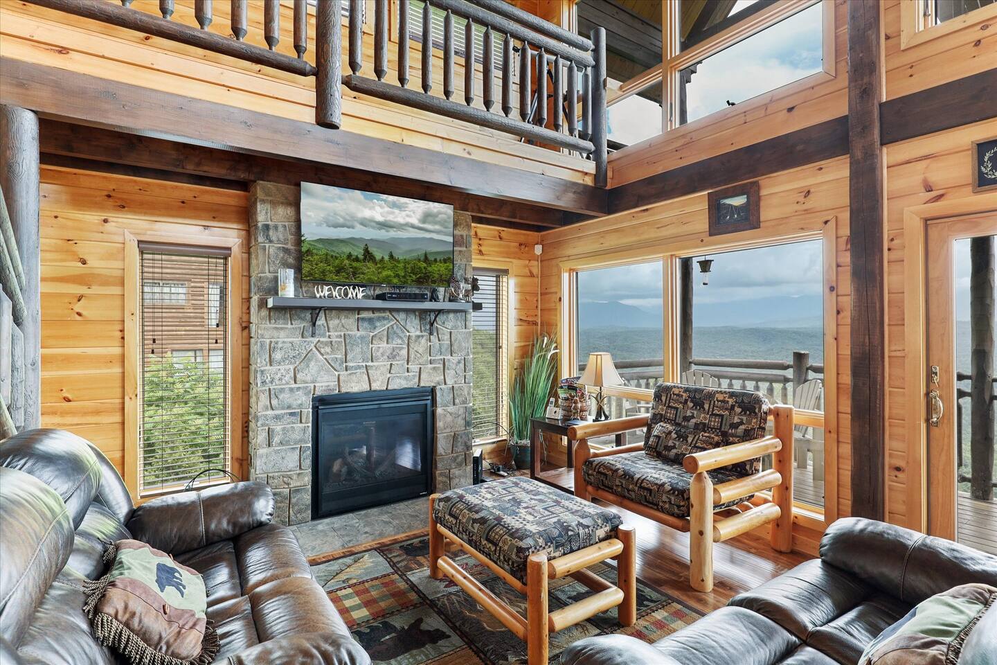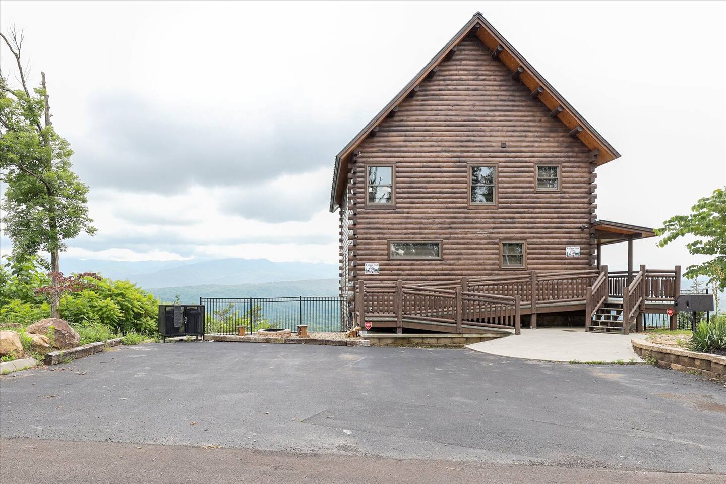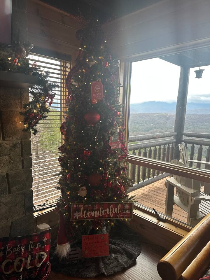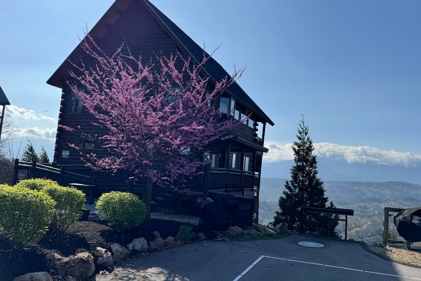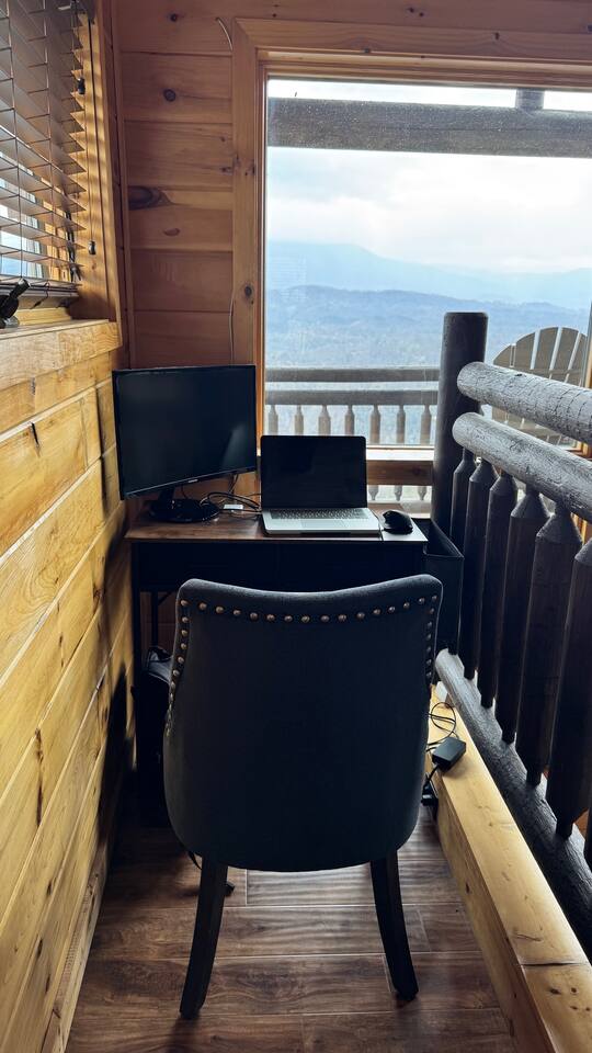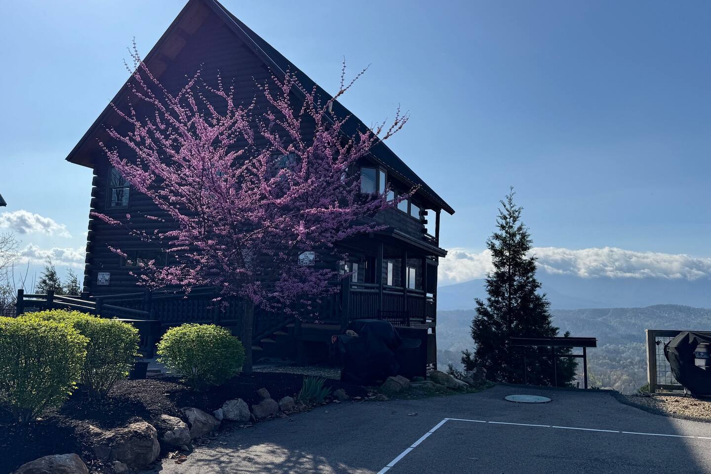 A View From The Top is a roomy Custom Cedar log cabin that sits on top of a mountain ridge 2000 ft above sea level and centrally located. This cabin was rebuilt brand new after the devastating fire that affected the area last year. Our luxury cabin has 2 master king bedrooms one on the main level and the other on the top level. There are 2 more bedrooms on the ground level that shares a full bathroom. The cabin is tastefully decorated and has custom blinds throughout except for the deck windows. Custom details and floor to ceiling windows throughout the cabin maximizes the breathtaking view from every room. There is a gas fireplace in the living space. The unobstructed panoramic view can be seen from all 3 floors and all 3 decks. Mountain view pictures were taken from our decks. We have an outdoor grill, Firepit , Arcade , jetted tub, hot tub, air hockey, pool table, outdoor corn hole bean bag toss, HDTV's in all bedrms, 55' Smart HDTV/DVR/Blu-ray DVD in living space with Netflix, free WiFi. DVD player in loft. Mountain road to cabin is a good two lane paved road. There is a large flat parking area in front of the cabin that can accommodate 4-5 vehicles depending on size. We furnish all linens, hand soap at every sink, shower gel, dish detergent and a starter supply of paper towels, toilet paper, trash bags, dishwasher and washing machine detergents. * One of the best mountain views in the area *Custom built True Luxury Log Cabin * Close to Parkway and shopping strip- less than 3 miles * 4 bedrooms, spacious 2700 sq ft cabin * large level parking area in front of cabin *High Speed Cable Internet with free Netflix Note: Only the main level of the cabin is Wheelchair friendly..