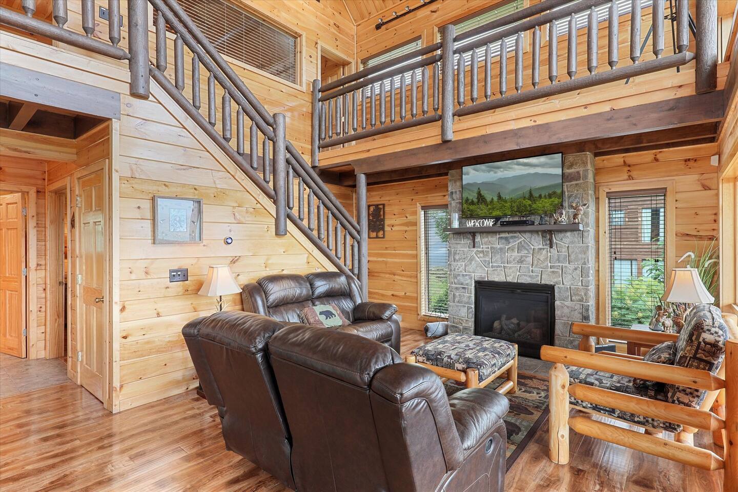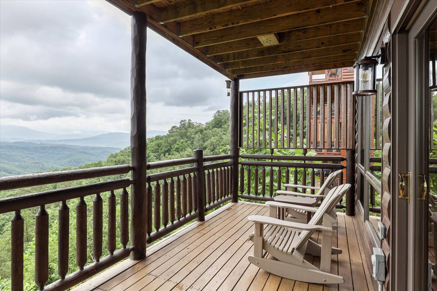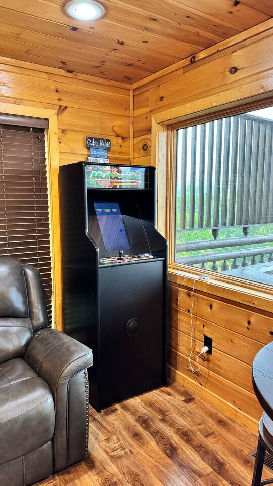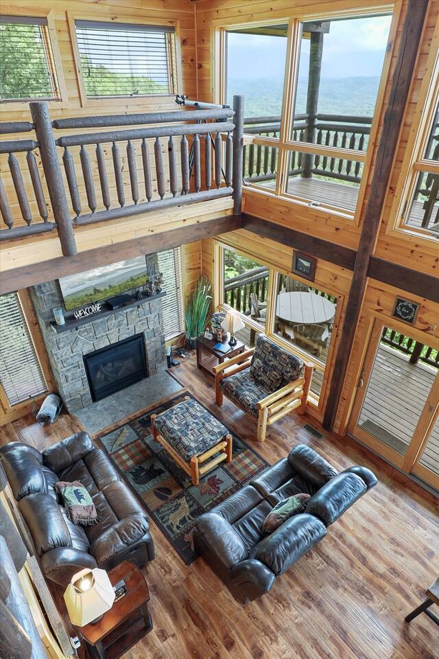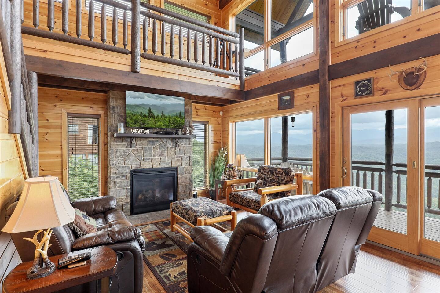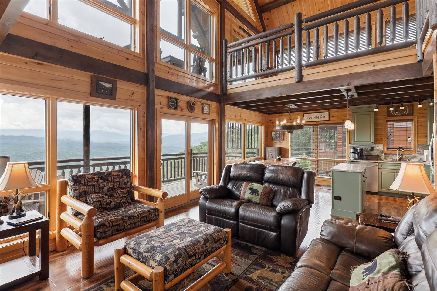 A View From The Top is a roomy Custom Cedar log cabin that sits on top of a mountain ridge 2000 ft above sea level and centrally located. This cabin was rebuilt brand new after the devastating fire that affected the area last year. Our luxury cabin has 2 master king bedrooms one on the main level and the other on the top level. There are 2 more bedrooms on the ground level that shares a full bathroom. The cabin is tastefully decorated and has custom blinds throughout except for the deck windows. Custom details and floor to ceiling windows throughout the cabin maximizes the breathtaking view from every room. There is a gas fireplace in the living space. The unobstructed panoramic view can be seen from all 3 floors and all 3 decks. Mountain view pictures were taken from our decks. We have an outdoor grill, Firepit , Arcade , jetted tub, hot tub, air hockey, pool table, outdoor corn hole bean bag toss, HDTV's in all bedrms, 55' Smart HDTV/DVR/Blu-ray DVD in living space with Netflix, free WiFi. DVD player in loft. Mountain road to cabin is a good two lane paved road. There is a large flat parking area in front of the cabin that can accommodate 4-5 vehicles depending on size. We furnish all linens, hand soap at every sink, shower gel, dish detergent and a starter supply of paper towels, toilet paper, trash bags, dishwasher and washing machine detergents. * One of the best mountain views in the area *Custom built True Luxury Log Cabin * Close to Parkway and shopping strip- less than 3 miles * 4 bedrooms, spacious 2700 sq ft cabin * large level parking area in front of cabin *High Speed Cable Internet with free Netflix Note: Only the main level of the cabin is Wheelchair friendly..