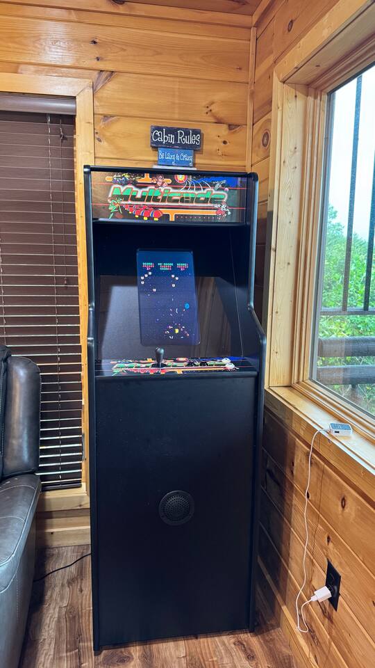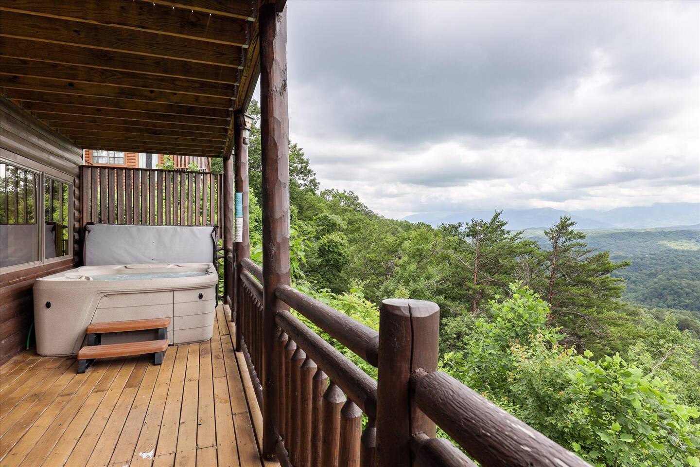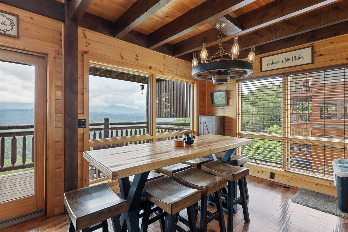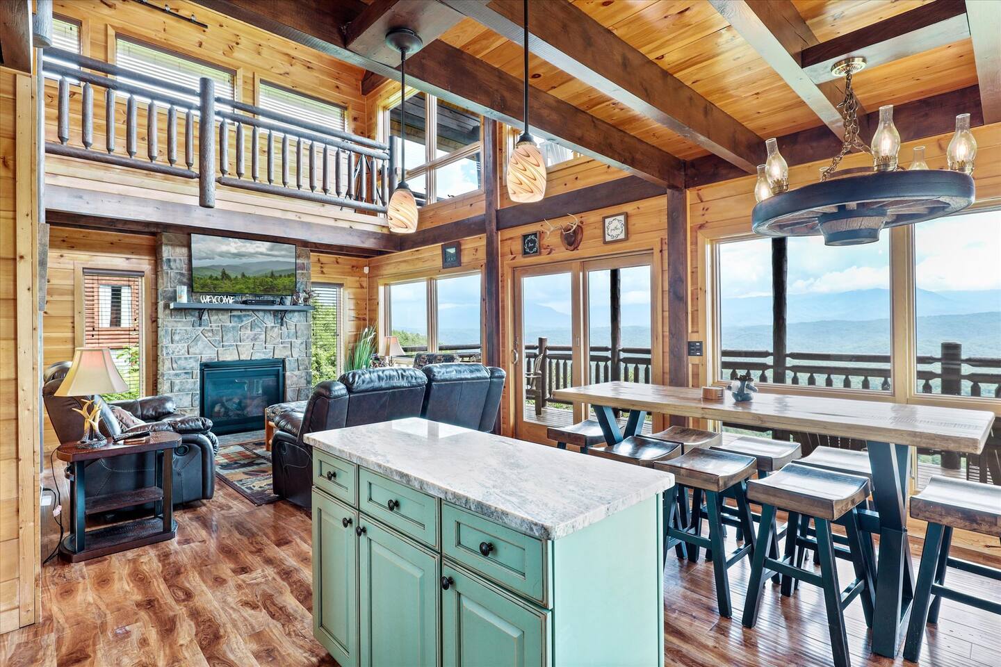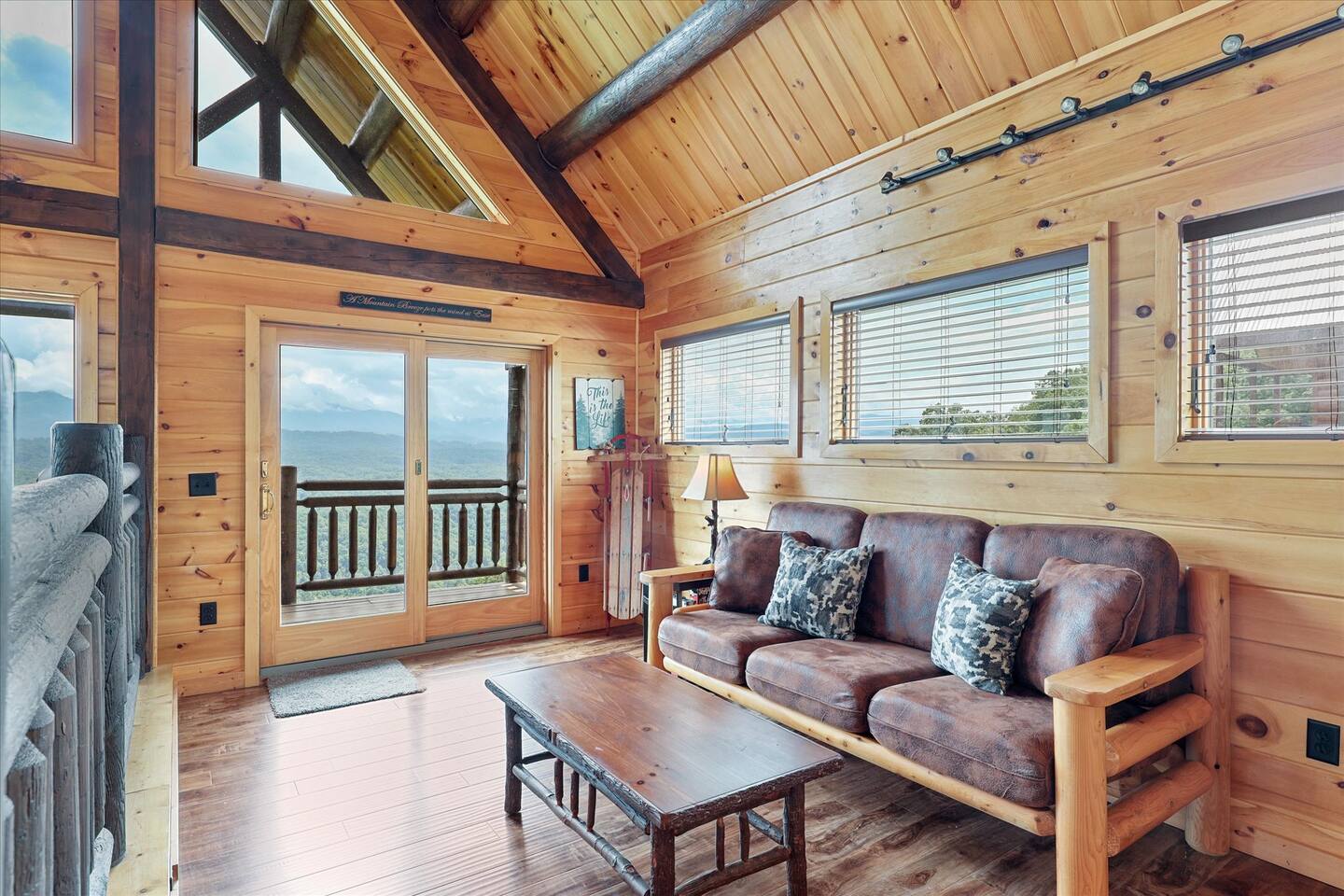 A View From The Top is a roomy Custom Cedar log cabin that sits on top of a mountain ridge 2000 ft above sea level and centrally located. This cabin was rebuilt brand new after the devastating fire that affected the area last year. Our luxury cabin has 2 master king bedrooms one on the main level and the other on the top level. There are 2 more bedrooms on the ground level that shares a full bathroom. The cabin is tastefully decorated and has custom blinds throughout except for the deck windows. Custom details and floor to ceiling windows throughout the cabin maximizes the breathtaking view from every room. There is a gas fireplace in the living space. The unobstructed panoramic view can be seen from all 3 floors and all 3 decks. Mountain view pictures were taken from our decks. We have an outdoor grill, Firepit , Arcade , jetted tub, hot tub, air hockey, pool table, outdoor corn hole bean bag toss, HDTV's in all bedrms, 55' Smart HDTV/DVR/Blu-ray DVD in living space with Netflix, free WiFi. DVD player in loft. Mountain road to cabin is a good two lane paved road. There is a large flat parking area in front of the cabin that can accommodate 4-5 vehicles depending on size. We furnish all linens, hand soap at every sink, shower gel, dish detergent and a starter supply of paper towels, toilet paper, trash bags, dishwasher and washing machine detergents. * One of the best mountain views in the area *Custom built True Luxury Log Cabin * Close to Parkway and shopping strip- less than 3 miles * 4 bedrooms, spacious 2700 sq ft cabin * large level parking area in front of cabin *High Speed Cable Internet with free Netflix Note: Only the main level of the cabin is Wheelchair friendly..
