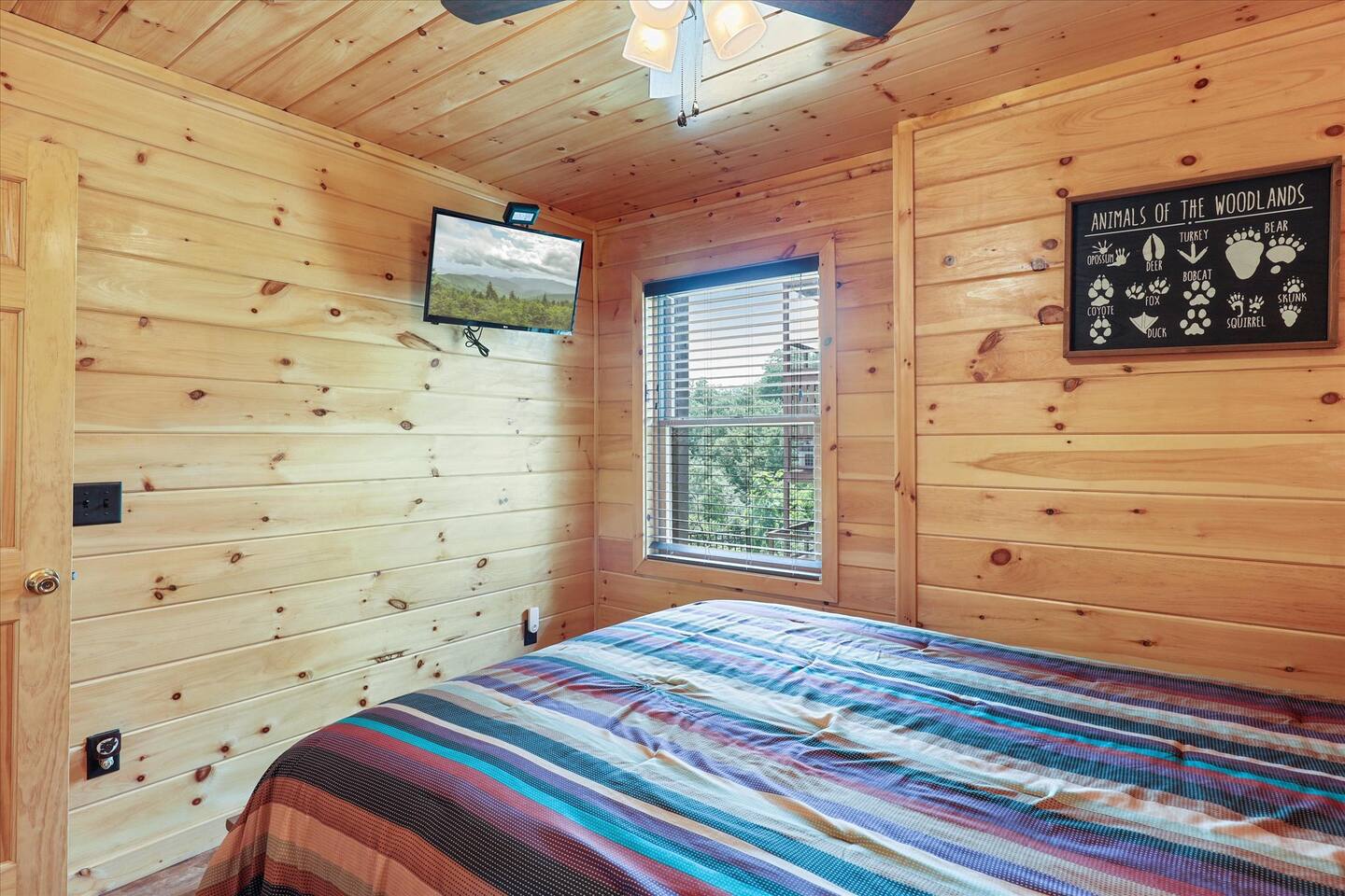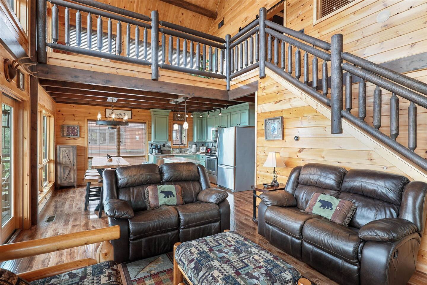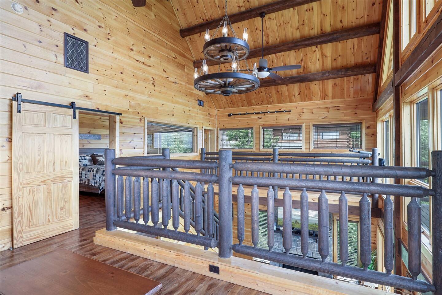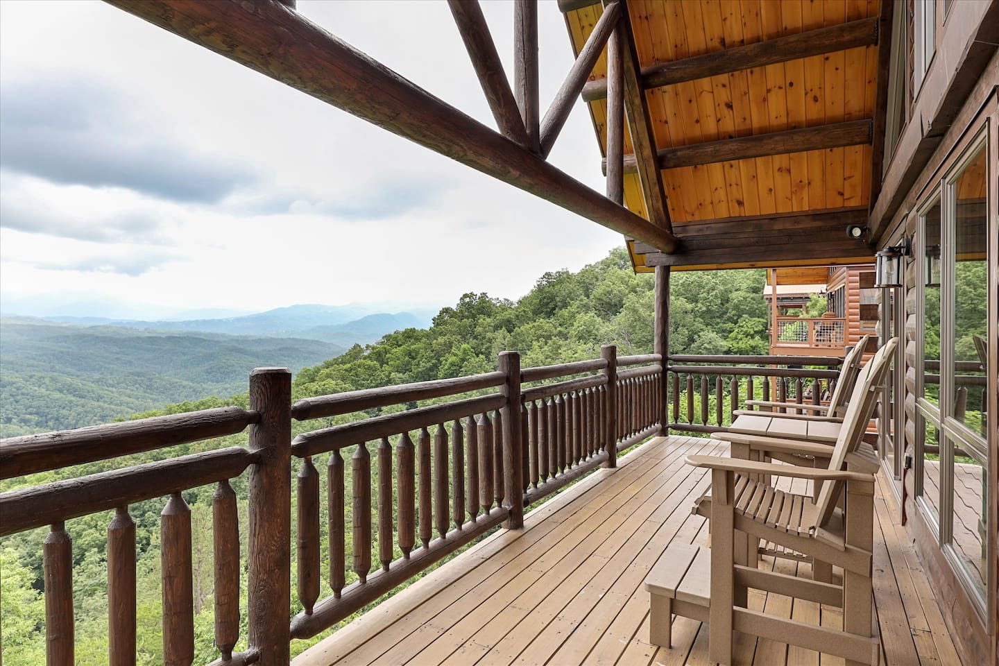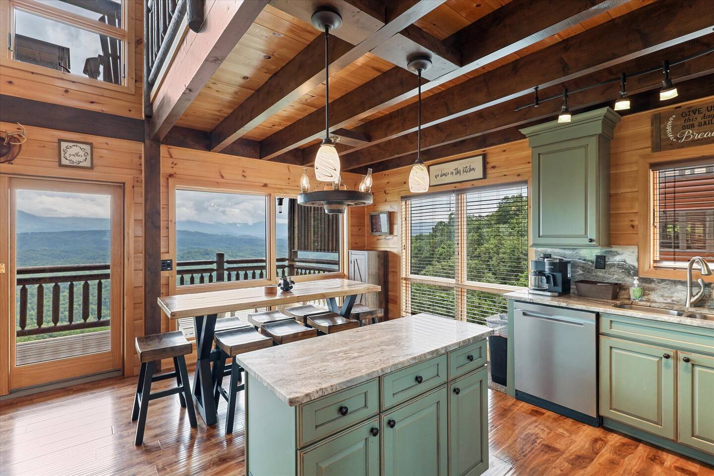 A View From The Top is a roomy Custom Cedar log cabin that sits on top of a mountain ridge 2000 ft above sea level and centrally located. This cabin was rebuilt brand new after the devastating fire that affected the area last year. Our luxury cabin has 2 master king bedrooms one on the main level and the other on the top level. There are 2 more bedrooms on the ground level that shares a full bathroom. The cabin is tastefully decorated and has custom blinds throughout except for the deck windows. Custom details and floor to ceiling windows throughout the cabin maximizes the breathtaking view from every room. There is a gas fireplace in the living space. The unobstructed panoramic view can be seen from all 3 floors and all 3 decks. Mountain view pictures were taken from our decks. We have an outdoor grill, Firepit , Arcade , jetted tub, hot tub, air hockey, pool table, outdoor corn hole bean bag toss, HDTV's in all bedrms, 55' Smart HDTV/DVR/Blu-ray DVD in living space with Netflix, free WiFi. DVD player in loft. Mountain road to cabin is a good two lane paved road. There is a large flat parking area in front of the cabin that can accommodate 4-5 vehicles depending on size. We furnish all linens, hand soap at every sink, shower gel, dish detergent and a starter supply of paper towels, toilet paper, trash bags, dishwasher and washing machine detergents. * One of the best mountain views in the area *Custom built True Luxury Log Cabin * Close to Parkway and shopping strip- less than 3 miles * 4 bedrooms, spacious 2700 sq ft cabin * large level parking area in front of cabin *High Speed Cable Internet with free Netflix Note: Only the main level of the cabin is Wheelchair friendly..