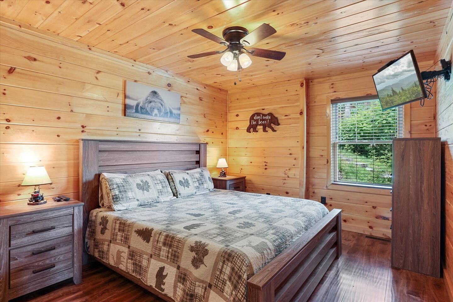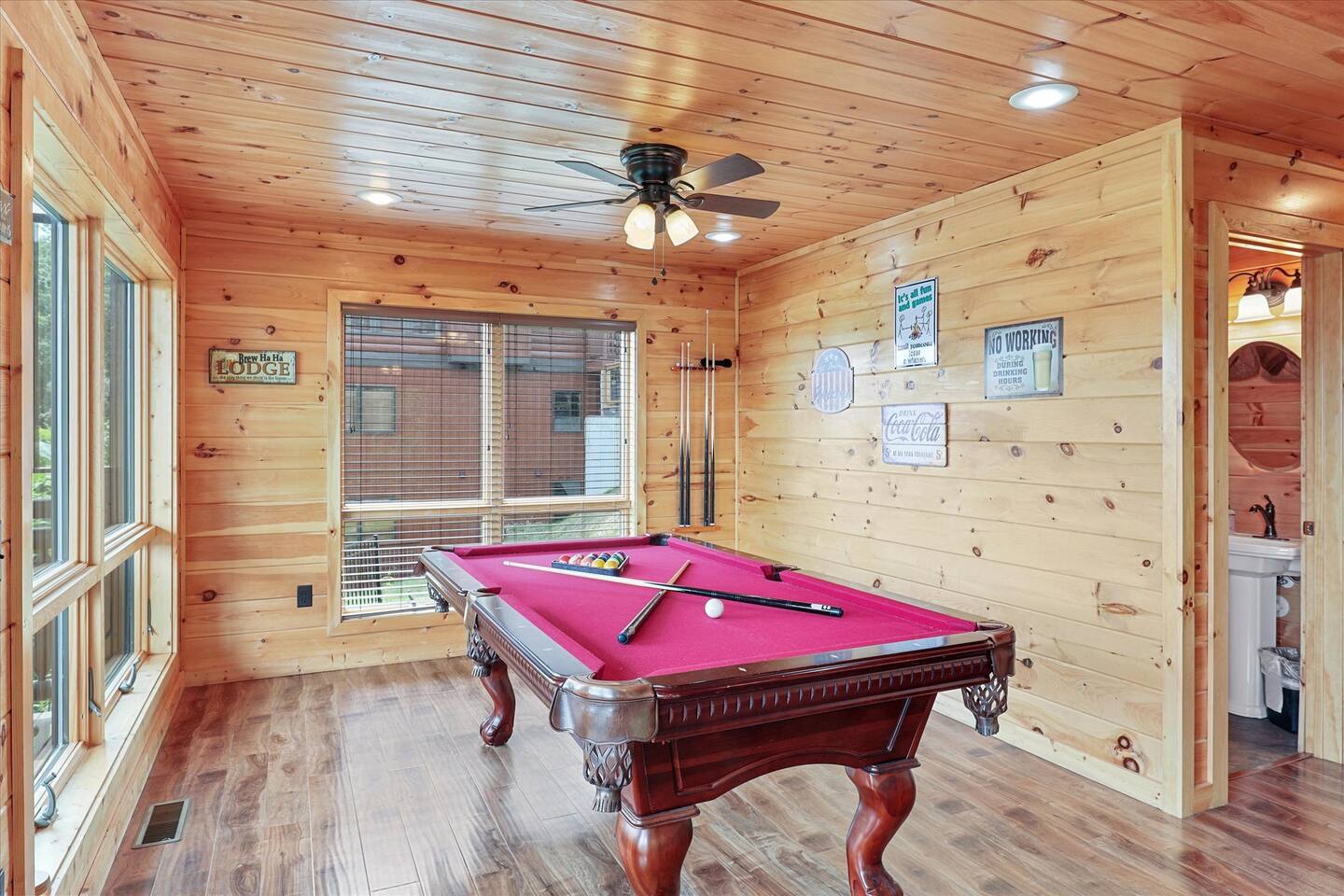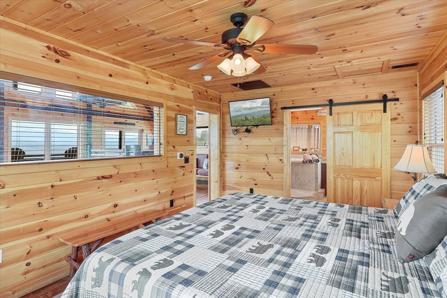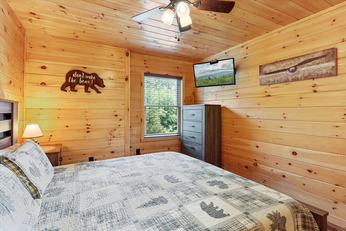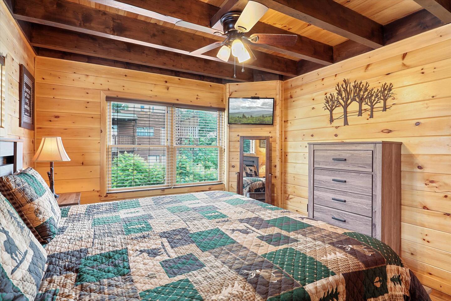 A View From The Top is a roomy Custom Cedar log cabin that sits on top of a mountain ridge 2000 ft above sea level and centrally located. This cabin was rebuilt brand new after the devastating fire that affected the area last year. Our luxury cabin has 2 master king bedrooms one on the main level and the other on the top level. There are 2 more bedrooms on the ground level that shares a full bathroom. The cabin is tastefully decorated and has custom blinds throughout except for the deck windows. Custom details and floor to ceiling windows throughout the cabin maximizes the breathtaking view from every room. There is a gas fireplace in the living space. The unobstructed panoramic view can be seen from all 3 floors and all 3 decks. Mountain view pictures were taken from our decks. We have an outdoor grill, Firepit , Arcade , jetted tub, hot tub, air hockey, pool table, outdoor corn hole bean bag toss, HDTV's in all bedrms, 55' Smart HDTV/DVR/Blu-ray DVD in living space with Netflix, free WiFi. DVD player in loft. Mountain road to cabin is a good two lane paved road. There is a large flat parking area in front of the cabin that can accommodate 4-5 vehicles depending on size. We furnish all linens, hand soap at every sink, shower gel, dish detergent and a starter supply of paper towels, toilet paper, trash bags, dishwasher and washing machine detergents. * One of the best mountain views in the area *Custom built True Luxury Log Cabin * Close to Parkway and shopping strip- less than 3 miles * 4 bedrooms, spacious 2700 sq ft cabin * large level parking area in front of cabin *High Speed Cable Internet with free Netflix Note: Only the main level of the cabin is Wheelchair friendly..