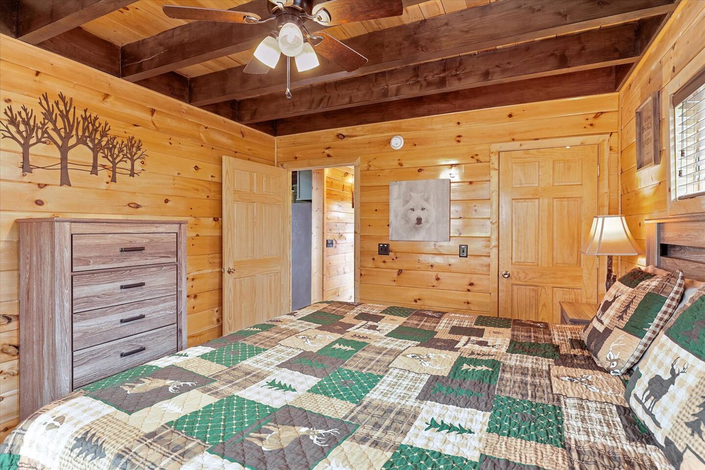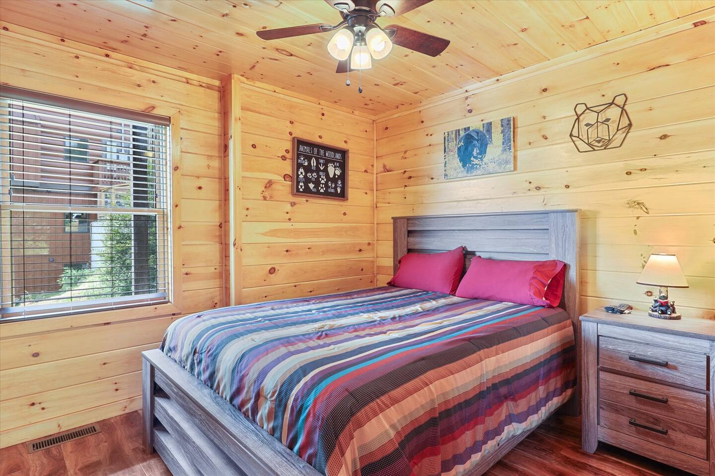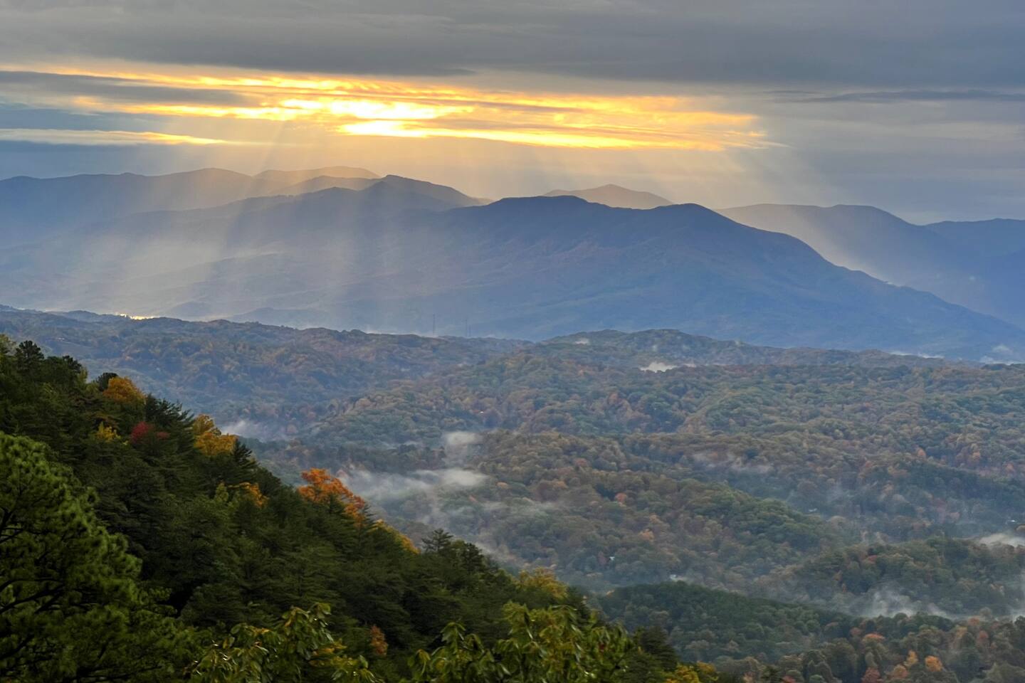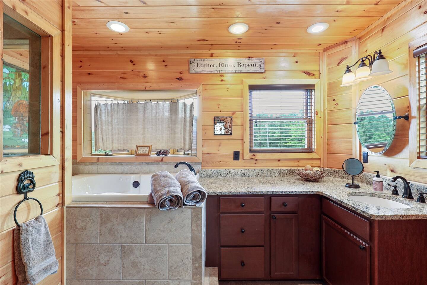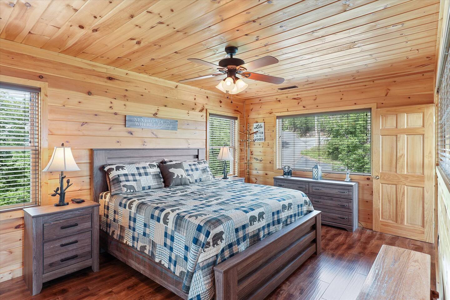 A View From The Top is a roomy Custom Cedar log cabin that sits on top of a mountain ridge 2000 ft above sea level and centrally located. This cabin was rebuilt brand new after the devastating fire that affected the area last year. Our luxury cabin has 2 master king bedrooms one on the main level and the other on the top level. There are 2 more bedrooms on the ground level that shares a full bathroom. The cabin is tastefully decorated and has custom blinds throughout except for the deck windows. Custom details and floor to ceiling windows throughout the cabin maximizes the breathtaking view from every room. There is a gas fireplace in the living space. The unobstructed panoramic view can be seen from all 3 floors and all 3 decks. Mountain view pictures were taken from our decks. We have an outdoor grill, Firepit , Arcade , jetted tub, hot tub, air hockey, pool table, outdoor corn hole bean bag toss, HDTV's in all bedrms, 55' Smart HDTV/DVR/Blu-ray DVD in living space with Netflix, free WiFi. DVD player in loft. Mountain road to cabin is a good two lane paved road. There is a large flat parking area in front of the cabin that can accommodate 4-5 vehicles depending on size. We furnish all linens, hand soap at every sink, shower gel, dish detergent and a starter supply of paper towels, toilet paper, trash bags, dishwasher and washing machine detergents. * One of the best mountain views in the area *Custom built True Luxury Log Cabin * Close to Parkway and shopping strip- less than 3 miles * 4 bedrooms, spacious 2700 sq ft cabin * large level parking area in front of cabin *High Speed Cable Internet with free Netflix Note: Only the main level of the cabin is Wheelchair friendly..
