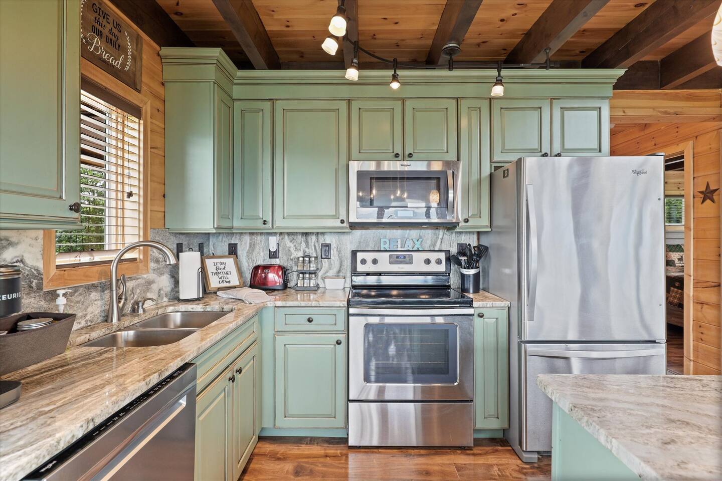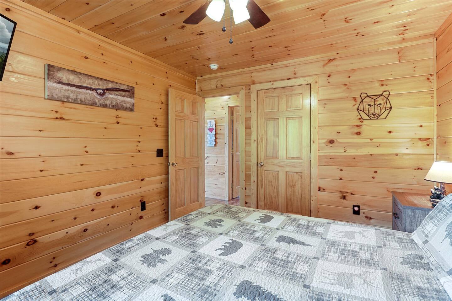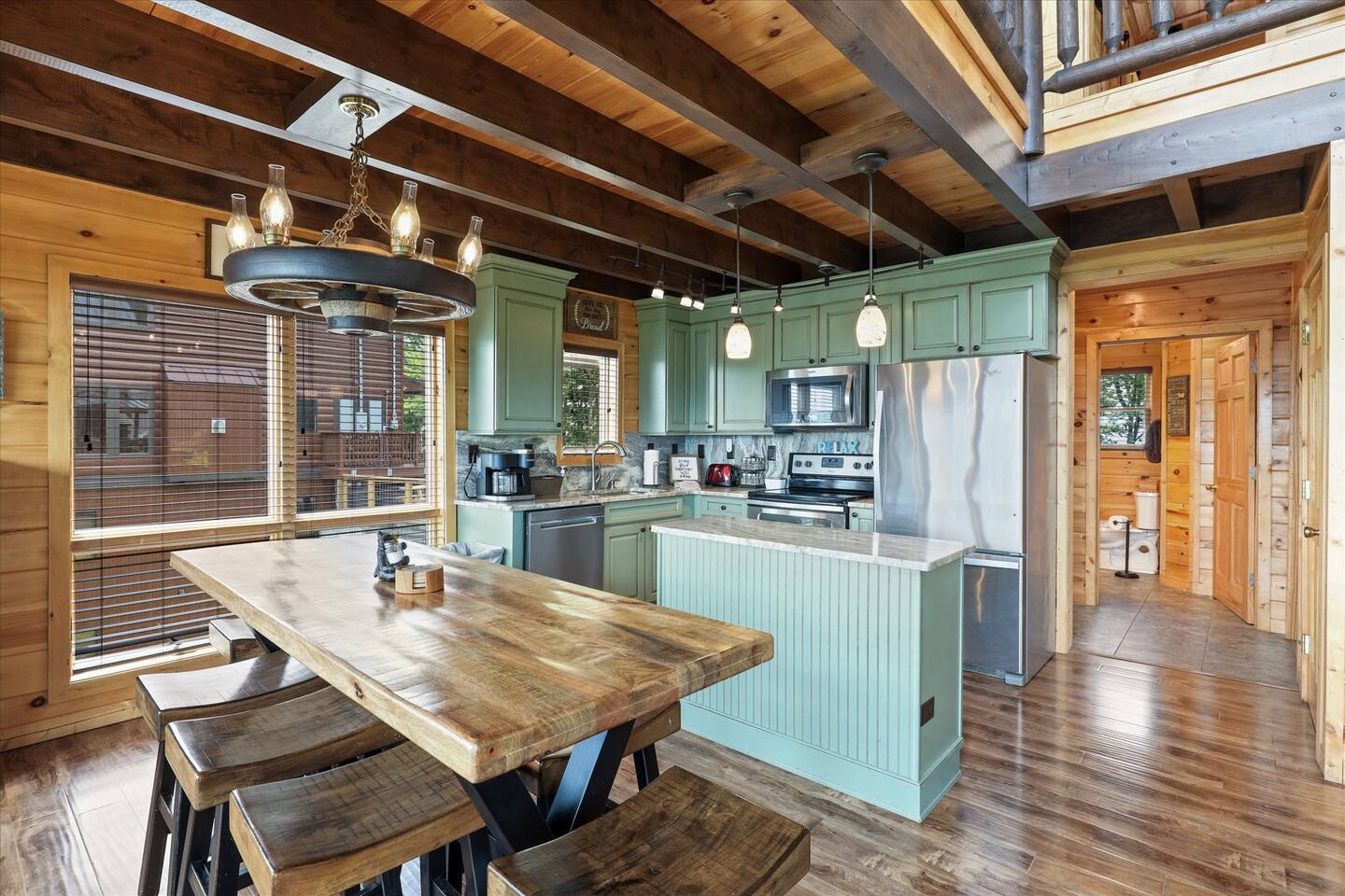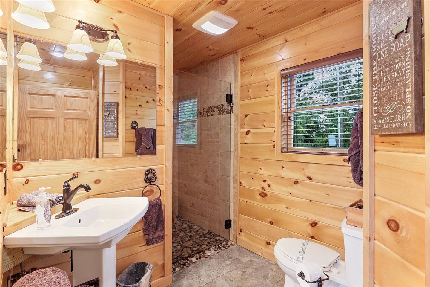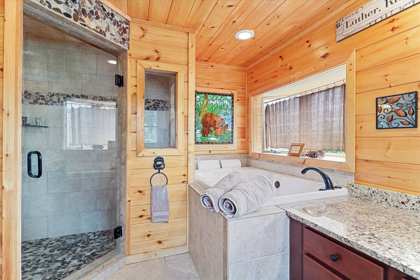 A View From The Top is a roomy Custom Cedar log cabin that sits on top of a mountain ridge 2000 ft above sea level and centrally located. This cabin was rebuilt brand new after the devastating fire that affected the area last year. Our luxury cabin has 2 master king bedrooms one on the main level and the other on the top level. There are 2 more bedrooms on the ground level that shares a full bathroom. The cabin is tastefully decorated and has custom blinds throughout except for the deck windows. Custom details and floor to ceiling windows throughout the cabin maximizes the breathtaking view from every room. There is a gas fireplace in the living space. The unobstructed panoramic view can be seen from all 3 floors and all 3 decks. Mountain view pictures were taken from our decks. We have an outdoor grill, Firepit , Arcade , jetted tub, hot tub, air hockey, pool table, outdoor corn hole bean bag toss, HDTV's in all bedrms, 55' Smart HDTV/DVR/Blu-ray DVD in living space with Netflix, free WiFi. DVD player in loft. Mountain road to cabin is a good two lane paved road. There is a large flat parking area in front of the cabin that can accommodate 4-5 vehicles depending on size. We furnish all linens, hand soap at every sink, shower gel, dish detergent and a starter supply of paper towels, toilet paper, trash bags, dishwasher and washing machine detergents. * One of the best mountain views in the area *Custom built True Luxury Log Cabin * Close to Parkway and shopping strip- less than 3 miles * 4 bedrooms, spacious 2700 sq ft cabin * large level parking area in front of cabin *High Speed Cable Internet with free Netflix Note: Only the main level of the cabin is Wheelchair friendly..